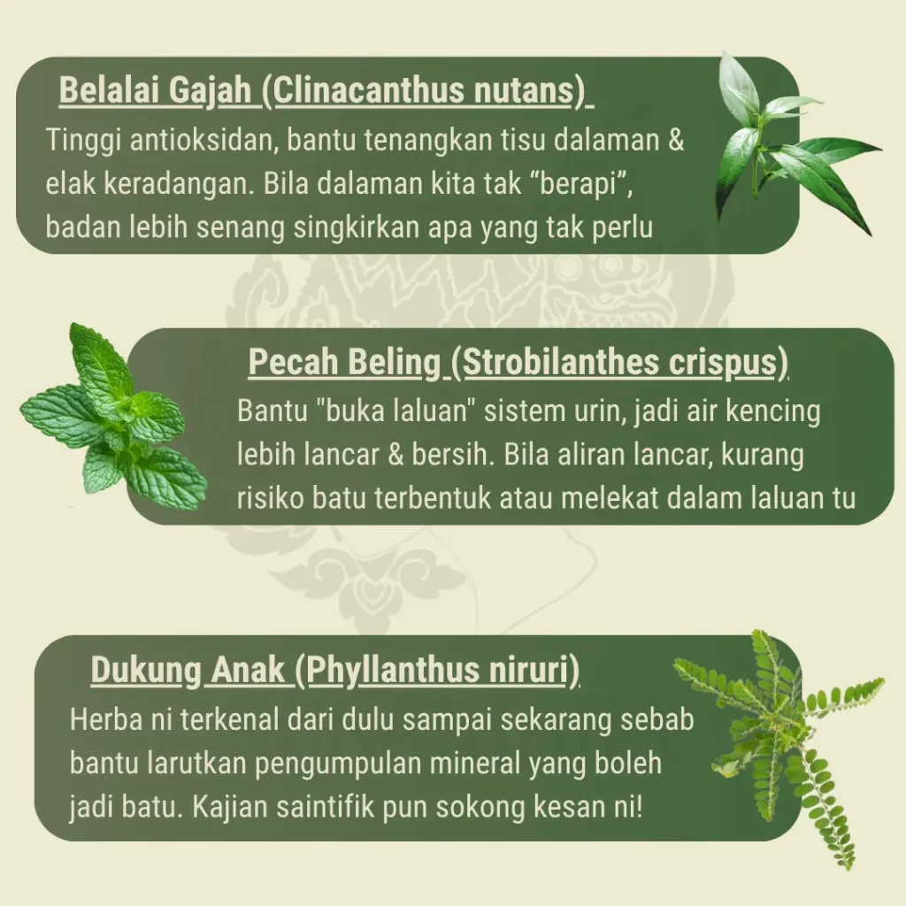 UraCare+ diformulasikan dengan 3 daun herba tradisional yang digunakan secara turun-temurun untuk bantu menyokong saluran kencing dan rasa selesa semasa buang air