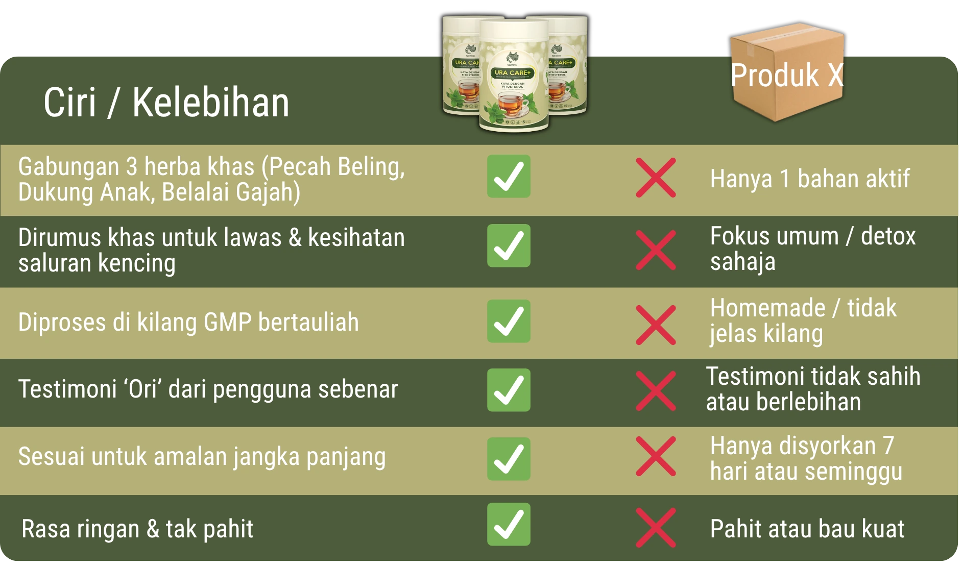 Ura Care+ ialah teh herba semula jadi, bukan ubat atau suplemen kimia.